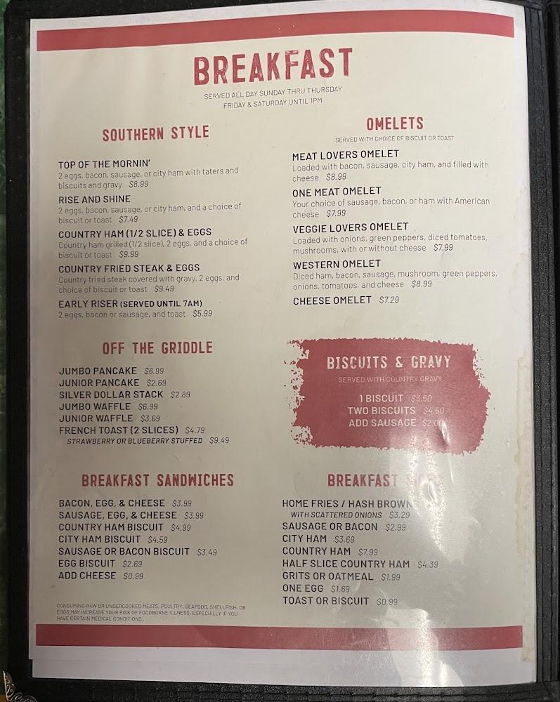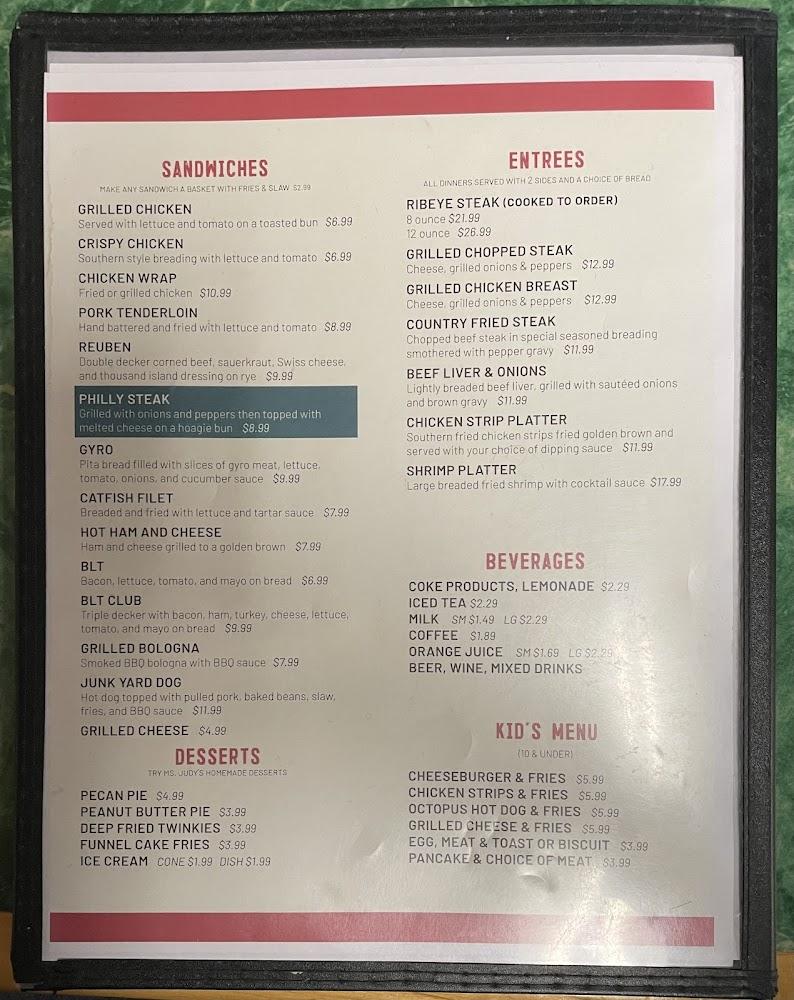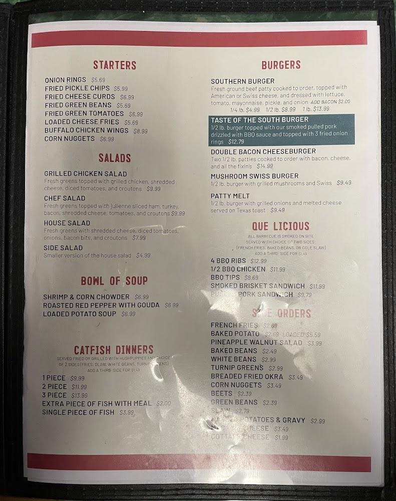 Highlight dishes like the Southern Burger and Fried Green Tomatoes stand out. Desserts cater to sweet lovers, featuring selections like Pecan Pie and Fried Twinkies.