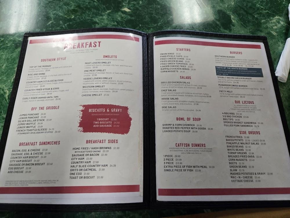 The menu at A Taste Of The South showcases a wide range of Southern comfort foods. Staples include various omelets, breakfast sandwiches, and hearty lunch options such as burgers and salads.